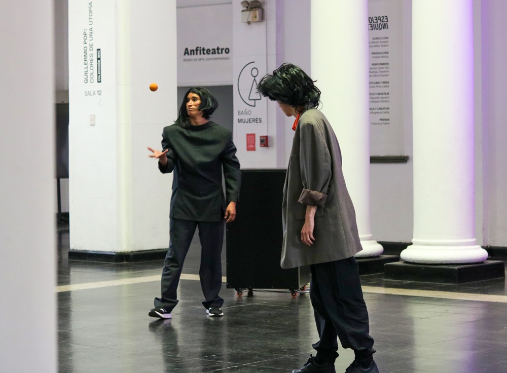 Ciertamente lo que experimentamos en “Espejo inquietante” no es terror, sino que más bien una especie de incomodidad con uno mismo. Curiosamente, “inquietante” es la palabra que define tanto el actuar de los intérpretes, como la disposición de ánimo de quienes somos espectadores, ya que la palabra tiene su etimología en el latín (inquietus), refiriendo a algo que se mueve mucho y no descansa (que no se queda quieto). Esta impasibilidad recorre toda la secuencia de acciones, donde los intérpretes a ratos interactúan solo entre ellos, con algunos objetos, con parte de su entorno (incluyéndonos) y finalmente, con proyecciones.