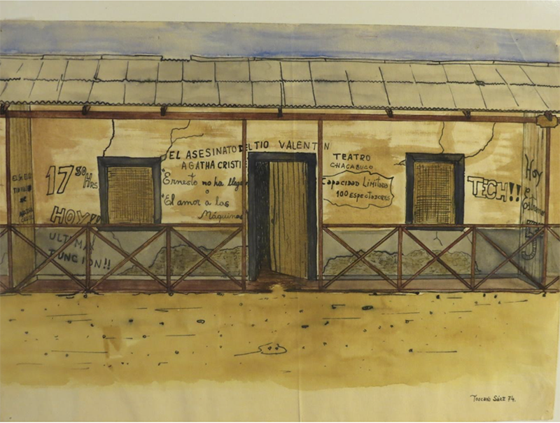 Fachada de la casa-teatro de Mario Molina Domínguez en el campo de concentración de Chacabuco en 1974 – advirtiendo la presencia “en cartelera” de la obra El asesinato del tío Valentín. Dibujo de Juan Sáez C., archivo personal Francisca Durán M. (inédito).