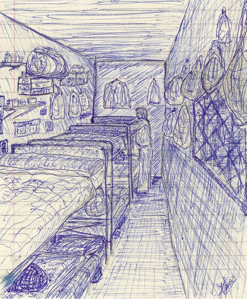 Mi celda, dibujado por Claudio Zaror Z. en Tres Álamos el 27 de mayo de 1975. Archivo Museo de la Memoria.