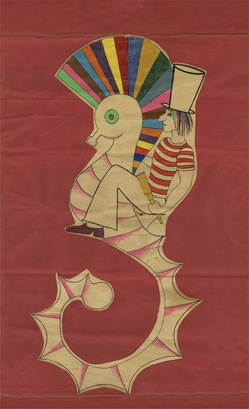 Óscar en un caballito de mar. “Personaje de la obra de teatro La Guerra escrita por Óscar Castro en el campo de prisioneros de Puchuncaví. Donación anónima (sin fecha), Archivo Museo de la Memoria.