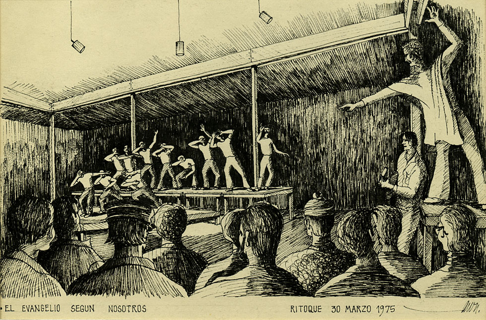 CR: Cabe señalar aquí que la primera especificidad del teatro en situación de cautiverio, desde la perspectiva de lo documental, es que deja poco registro dramatúrgico (textos) y prácticamente ninguno de carácter audiovisual. Por lo mismo, ha sido particularmente significativo –y conmovedor, a la vez– poder encontrarse con algunas obras teatrales originales e inéditas, escritas dentro de los campos; y con bocetos y dibujos de algunas de esas salas y teatros de los campos, en el momento de la función o hasta en etapa de ensayos. Son fuentes de primera mano como ésas las que, sin duda, nos han permitido darle una dimensión más orgánica, más concreta al trabajo de reconstitución.