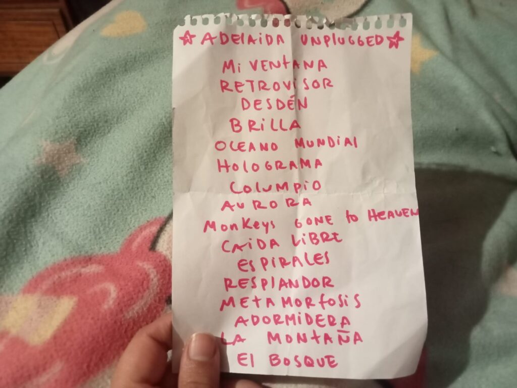 Creo que, como oyente, cada experiencia es personal. Y esta intimidad que Adelaida nos compartió, tanto desde el formato acústico, como desde hacernos parte de un laboratorio de experimentación sonora —y sensorial—, no es algo que todas las bandas hagan. Llevan años, premios, discos, giras, y mantienen humildad y cercanía. La cercanía de permitir mostrarnos el error como parte de la creación artística y del habitar un escenario, con sus dinámicas, el correr para acá, conectar esto, falta un enchufe, trae el pedal… es hacernos parte. Es, para mí, ver que ellxs comprenden el lugar que sus oyentes tienen dentro de su creación.