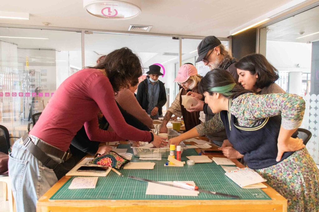 Somos una equipa grande. Acá tenemos tres compañeras que se encargan de la producción, distribución y gestiones varias. Parte de la producción de los libros es artesanal y otra es industrial, entonces los libros que se hacen artesanalmente lo hacemos aquí en el taller. Allí tenemos nuestras máquinas inkjet, muy caseras, y distintas herramientas de encuadernación y serigrafía. Las chicas producen acá y se encargan de llevar el cuidado de los libros. La producción industrial la hacemos en imprenta. Y allá en Quito también funciona de la misma manera.