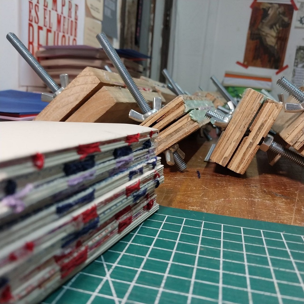 Hay textos que piden ser más grandes, otros más pequeñitos, otros que sean de bolsillo, otros de mesa, otros tienen que tener una extensión de un poster, postal, QR, intentamos que esos elementos sean en serigrafía. Le damos también mucho valor a otros materiales gráficos dentro del libro: que lleve serigrafía, grabado, que se vea que es una encuadernación artesanal; intentamos ser correspondientes con lo que el texto mismo va activándonos. Vamos sacando conceptos del libro: suena de esta forma, la voz es de tal manera, la tipografía, el color, el hilo, la portada, etc.