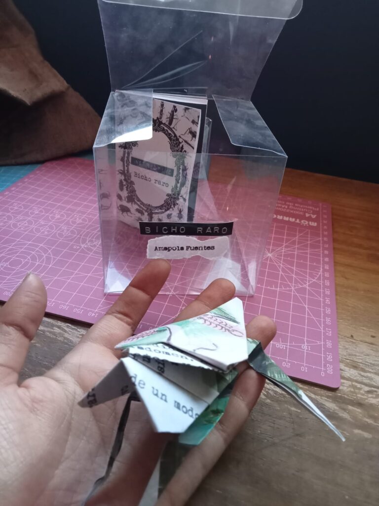 Un paquete se presenta como anomalía para la lectura. Abrimos el cubo de plástico transparente, que contiene un origami impreso, un fanzine-instructivo y unos lentes de Fresnel. De inmediato, la transparencia del cubo me parece una ironía ante la diversidad de los códigos contenidos. No lo veo con la reticencia que me generan aquellos dispositivos pretenciosos, así llamados objetuales, con los que textos que no consiguen llegar a libros se enmascaran en recursos visuales o materiales, para situarse en el mercado de curadores y coleccionistas. No. Bicho raro está hecho con dedicación, pero es humilde frente a los atributos de su despliegue.