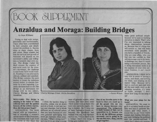 Gloria y yo desarrollamos el proyecto editorial de “Este puente” como escritoras, activistas, feministas, que organizaban lecturas y eventos culturales en la área de la Bahía de San Francisco, pero que teníamos muy pocas publicaciones a nuestro nombre. A finales de los años 70, las chicanas estaban apenas empezando a publicar algunas cosas en revistas y folletines de editoriales pequeñitas, y lo mismo decirse de las mujeres indígenas estadounidenses y de ascendencia asiática que escribían en Estados Unidos en esa época, salvo por algunas excepciones. Aún así, contamos con el apoyo a lo largo de todo el camino. Con frecuencia Gloria ha señalado que la historia de “Este puente” le debe mucho a la artista-escritora Merlin Stone, quien fue una de las principales defensoras del libro. En lo personal, quisiera reconocer también a otras: La poeta feminista y lesbiana Adrienne Rich le dio mucha visibilidad al proyecto. En 1979, con un nudo de timidez en la garganta, porque no era más que una simple estudiosa de su obra a la que no habíamos conocido, le envié a Adrienne un borrador de “La Güera” para anunciarle nuestros planes de publicación y pedirle su apoyo. Para mi sorpresa, me invitó a publicar el ensayo en el libro de ”Coming Out Stories”, Persephone Press, 1980, para el cual ella estaba escribiendo un prólogo. Adrienne también se convirtió en una promotora activa de la fundación The Kitchen Table Women of Color Press y la iniciativa de republicar “Este puente” tras la desaparición de la editorial Persephone en 1982.