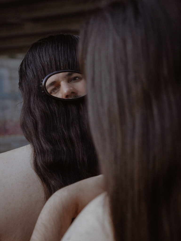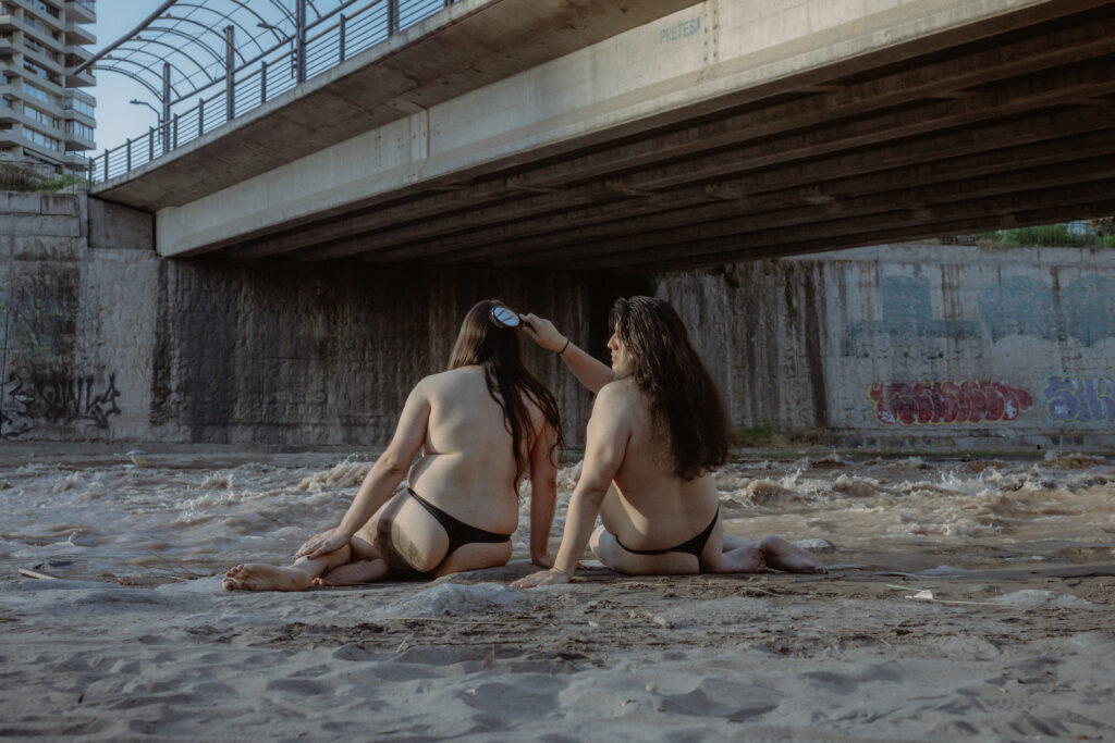 El cabello de ambas corporalidades refleja su lugar político: la tenacidad y la oblicuidad de sus fibras identitarias que las separan y las unen en una misma insistencia contra las violencias. La luz rasante, las texturas terrosas, lo cementado, la piel y el flujo incesante del agua configuran un escenario donde los cuerpos se presentan con disrupción. Desde el silencio, la serie despliega una metáfora visual que construye una atmósfera oscilante y desbordante entre lo irreal y lo real. Las Ninfas del Mapocho se convierte en declaración de existencia, amistad y fragilidad, una reivindicación poética y política en un mundo herido.