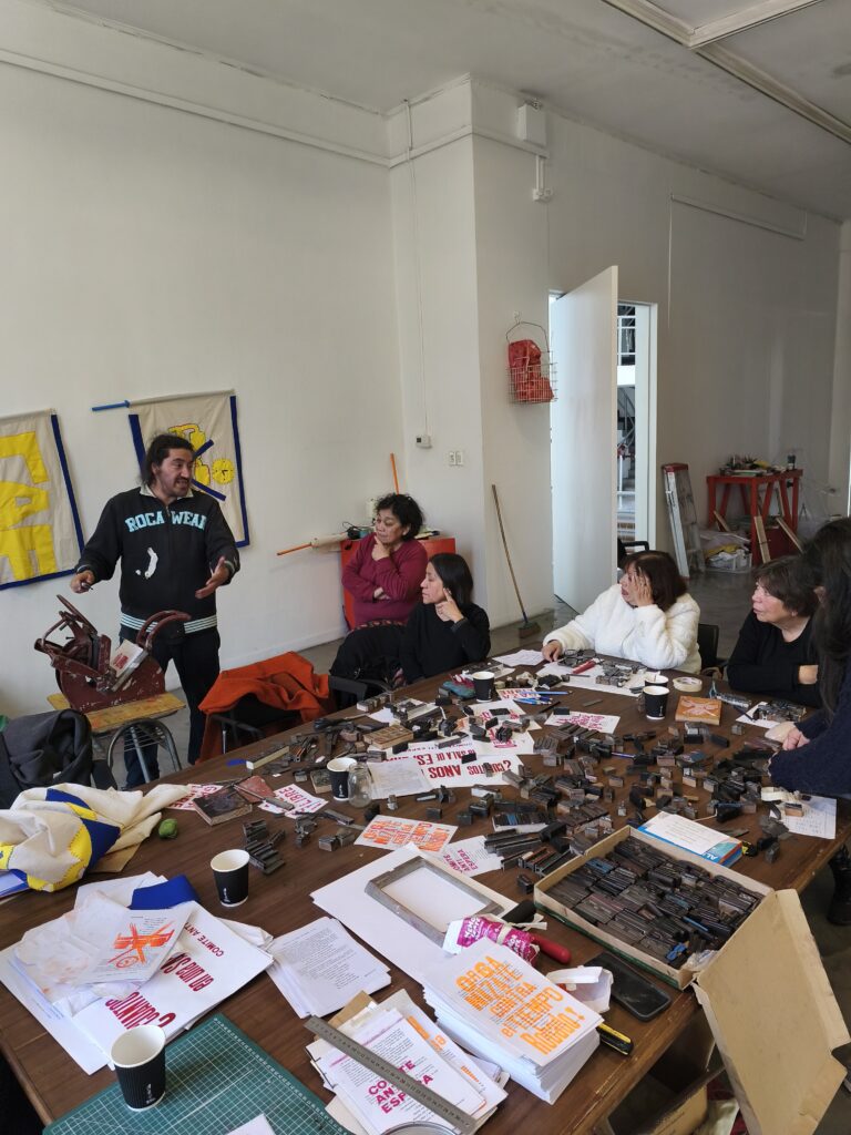 Sobre la gran mesa en el centro se despliegan los materiales de un taller de impresión de afiches: tipos móviles o piezas de metal con distintas letras y caracteres, papeles, rodillos y tinta. La actividad invita a las personas presentes a imprimir su propio afiche, replicando la estética de las campañas políticas comunitarias.