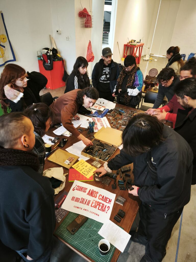 La técnica, traída hasta el taller de Las Honorarias por Danilo de la Escuela Gráfica Popular, requiere minuciosidad y tiempo: cada letra debe ser elegida y dispuesta. En una época donde la tecnología avanza al servicio del progreso, el afán es reducir el tiempo de los procesos de producción. En el espacio del arte, en cambio, esta dilación es necesaria. Loreto explica: “Desde que pensamos en el Comité, sabíamos que había que hacer panfletos y ojalá distribuirlos por todos los lugares. Podríamos haber impreso en una en una fotocopiadora, pero nos interesaba rescatar la parte análoga”.
