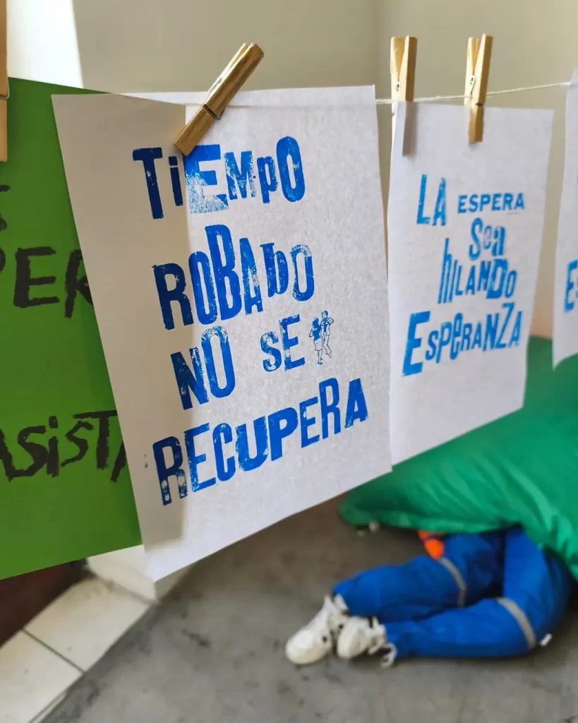 “Uno de estos talleres lo hicimos con mujeres mayores y varias participantes eran de la agrupación Textileras del Museo Salvador Allende. Esa agrupación se disolvió hace muy poquito y estaban necesitando un espacio comunitario en el que pudiesen crear algo con un sentido crítico y desde el arte”, cuentan. “Una de las frases que ellas eligieron fue: “Que la espera sea hilando esperanza”, que viene muy desde su oficio, pero también desde una perspectiva distinta a la nuestra y muy válida; nos dieron a entender que, para ellas, tejer no es matar el tiempo, sino resistir el paso del tiempo”, comentan.