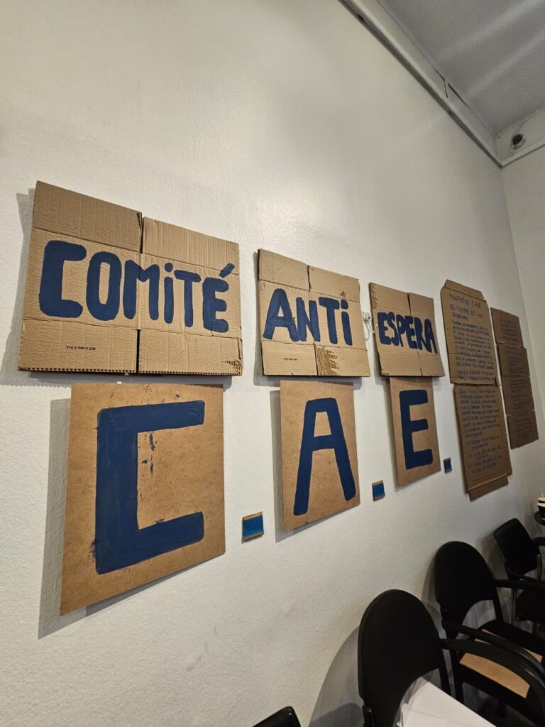 Es sábado por la mañana y una decena de personas está reunida en una de las salas del Centro Cultural España. En las paredes hay carteles y banderas que parecen sacados de una protesta. “El tiempo es nuestro”, “+ pobre = + demora”, “Las filas son un modo de control”, dicen algunas de las inscripciones que están estampadas sobre trozos de papel o de cartón. Es el primer encuentro del Comité Anti Espera (C.A.E.).