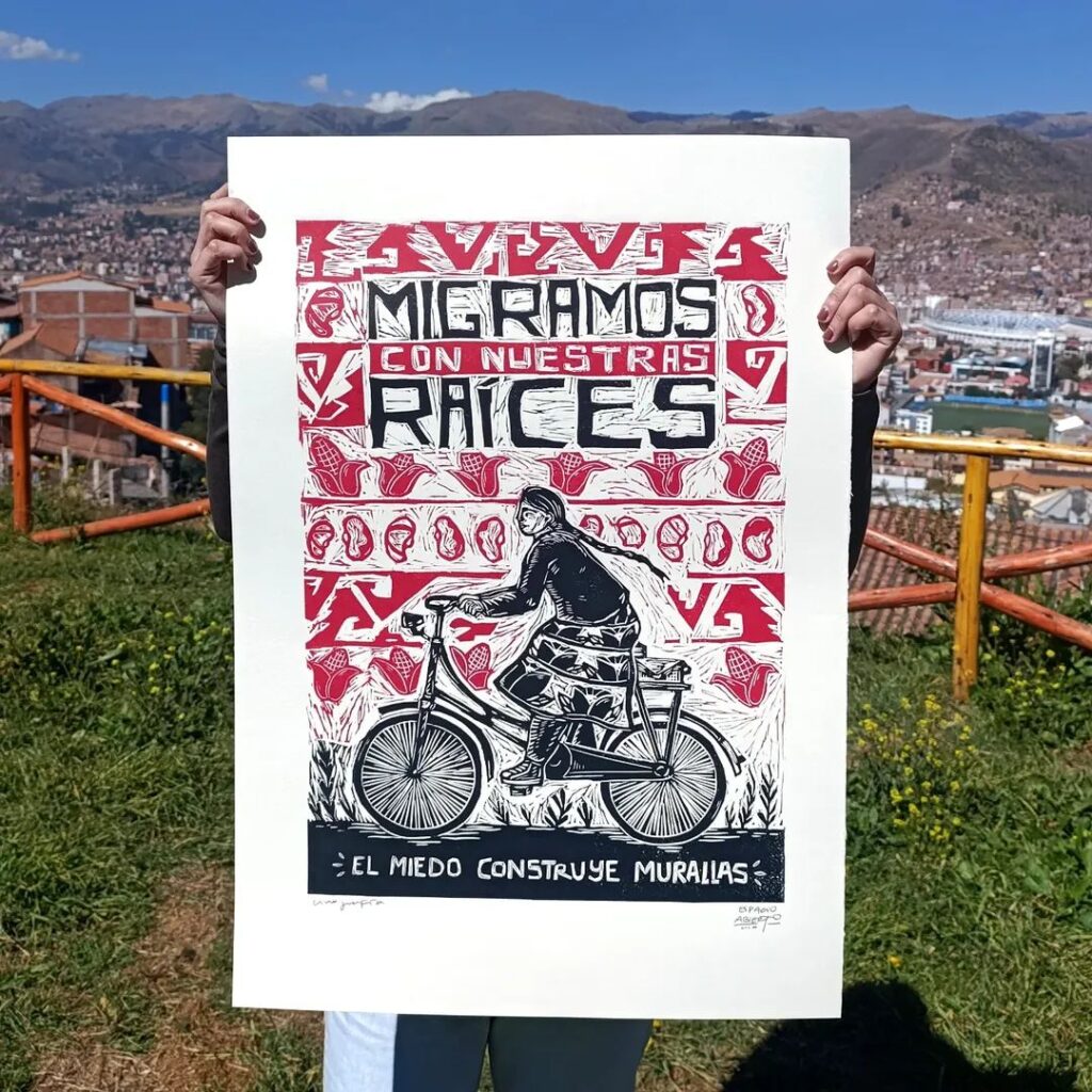 M: Verlos representados de otras formas tiene que ver con cómo nos hemos sentido en diferentes momentos. Recuerdo que hubo la marcha desde Centroamérica hacia Estados Unidos por el derecho a migrar y sale esa frase que dice “Migramos con nuestras raíces” y lo vimos y dijimos qué chévere, entonces hicimos este personaje que es una mujer andina en una bicicleta, que es algo que muy poco se ve y que en general no está representado. Eso fue chévere, como tú dices, es, y nos damos cuenta de que a veces hemos inventado unos personajes o lo hemos sacado de su contexto más tradicional, más folclorizado. En este nuevo contexto, adquiere otro sentido y eso es bacán y también hemos usado representaciones muy tradicionales como el mate burilao y lo hemos puesto en una fiesta, porque es otra forma de verlo, pues.