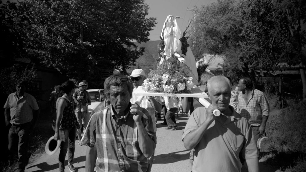Sebastián: Era algo valioso. Nos llevó a conectar con algunas raíces, quisimos llevarlo a más gente. Y de ahí, empezamos a asistir a vigilias. Creo que la primera fue la de Lourdes, en Quinta Normal. Ahí empezamos a conocer personajes, conocimos a don Domingo Pontigo. Después conocimos a don Arnoldo y fue como “ya, este personaje tiene más magnetismo, carisma, algo más arquetípico”. Cuando conocimos su casa, cómo vivía y a toda su familia, fue muy claro que era nuestro personaje. Después llegamos a Caballito Blanco y al mundo de los bailes chinos. Nos empezamos a debatir en cómo incorporar los bailes chinos, porque en un principio Caballito Blanco era un personaje cantor. Y de a poco fuimos metiéndolo (al documental) como alférez del baile chino y al final decidimos: Caballito va a representar la tradición de los bailes chinos y don Arnoldo va a representar la tradición del canto a lo divino. Igual se mezcla, Caballito también es payador.