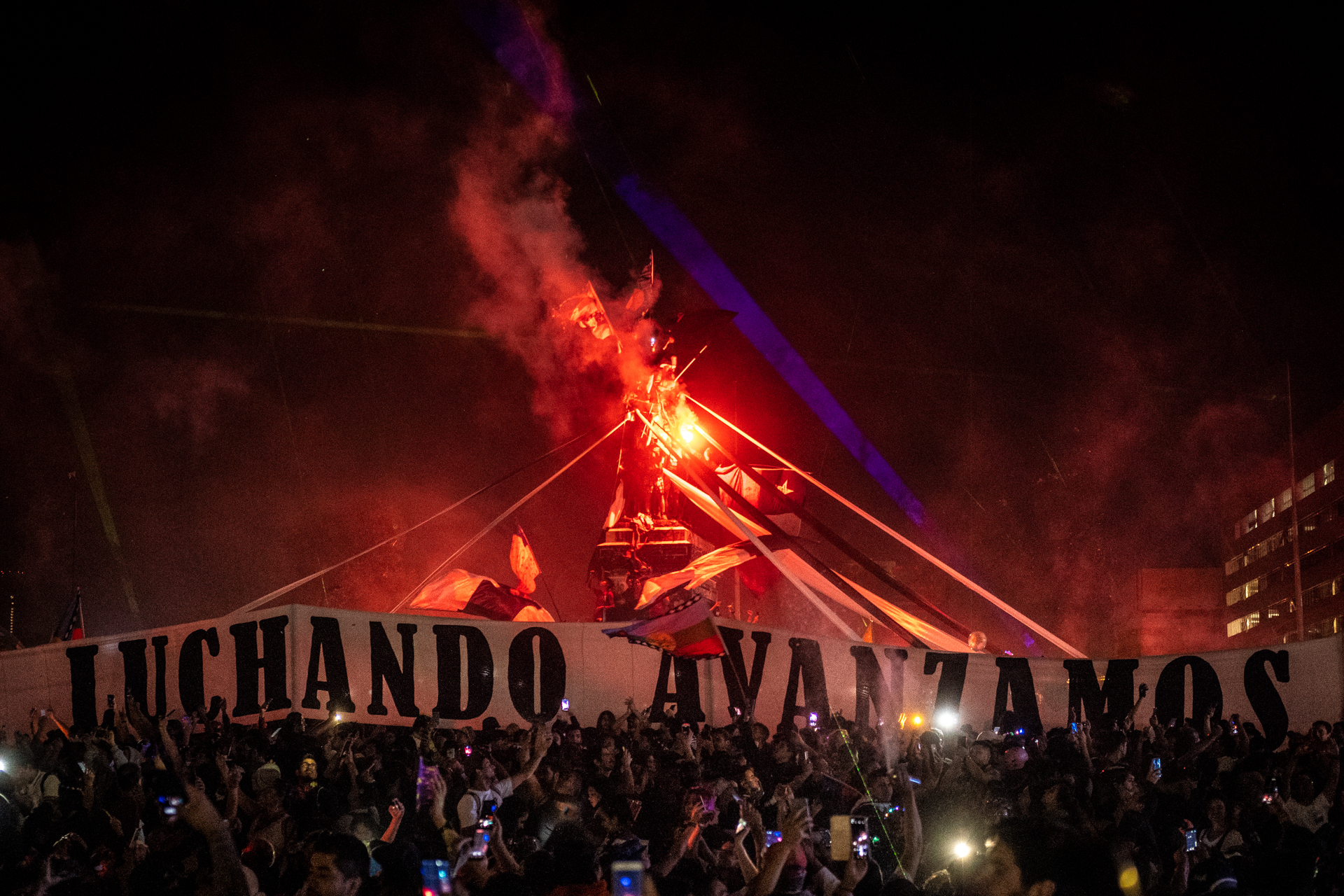 Un enorme lienzo se extiende bajo la estatua ecuestre del infame general Baquedano. En él se lee: “luchando avanzamos”. En unos minutos más, los cientos de punteros láser derribarán un dron que caerá en picada con sus sensores saturados de vectores verdes. Los cantos del estallido de octubre retumban bajo un cielo promisorio. La multitud se aglomera alrededor de grupos artísticos que a pocos metros entre sí ejecutan rituales paralelos para recibir este cambio de calendario. El edificio de la telefónica tiene proyectada a Venus en el costado, y la estrella que guía el derrotero de la espiritualidad mapuche acompaña desde lo alto esta cumbia encabritada. Un poco más allá los capuchas se arriman a las fogatas para secarse los pies. De fondo, empieza a sonar el Baile de los que sobran. En la esquina de Irene Morales con la Alameda, las velas de la animita de Mauricio Fredes iluminan el rostro de los demudados cortejos que se detienen delante de ella para pensar en el muerto de la revuelta, en el trágico peso del año que pasa, y en la exorbitante deuda que arrastrará el que comienza. Como nunca se avizora el horizonte de una nueva vida. Como nunca el pueblo reconoce su musculatura en las calles que toma por asalto. Nadie más abrazará un paco pa año nuevo, eso es seguro. Los fuegos artificiales revientan contra la noche de los primeros minutos del nuevo mes, de un nuevo año.